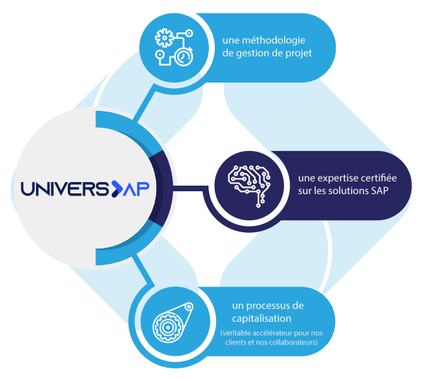 UNIVERS AP vous accompagne dans vos choix et s’engage à vos côtés sur des projets d’innovation (HANA, mobilité, optimisation fonctionnelle des upgrades) et s’engage sur l’atteinte des objectifs aux côtés de vos équipes. Les méthodologies sont adaptées à vos contraintes (budget, délais, équipes, compétences) et les savoirs faires partagés.